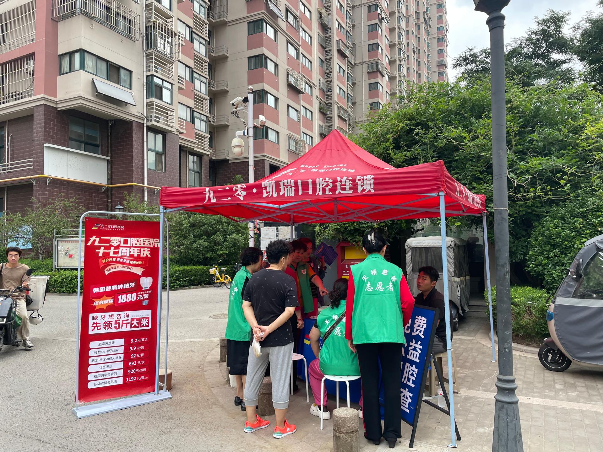 【暖心义诊进社区,微笑守护暖金秋】 尊敬的官中街社区居民: 值此九二零全国爱牙日来临之际,官中街社区联合九二零口腔医院开展“口腔健康公益义诊”活动! 🦷 活动时间:9月16日周二-9月17日周三 ⏰ 每日时段:上午7:30-10:30 下午4:30-19:00 📍 活动地点:官扎营新区南区北门小广场 ✨ 双诊福利一览: ✅ 免费口腔专业检查(现场出具纸质版检查报告,清晰了解口腔状况) ✅ 免费血压测量+免费空腹血糖检测(全面关注您的健康) ✅ 残根、松动牙拔除9.9元 ✅ 缺牙患者专属:现场领取**盖章宣传页**,凭页于店庆日来九二零口腔医院免费拍片即可免费领取