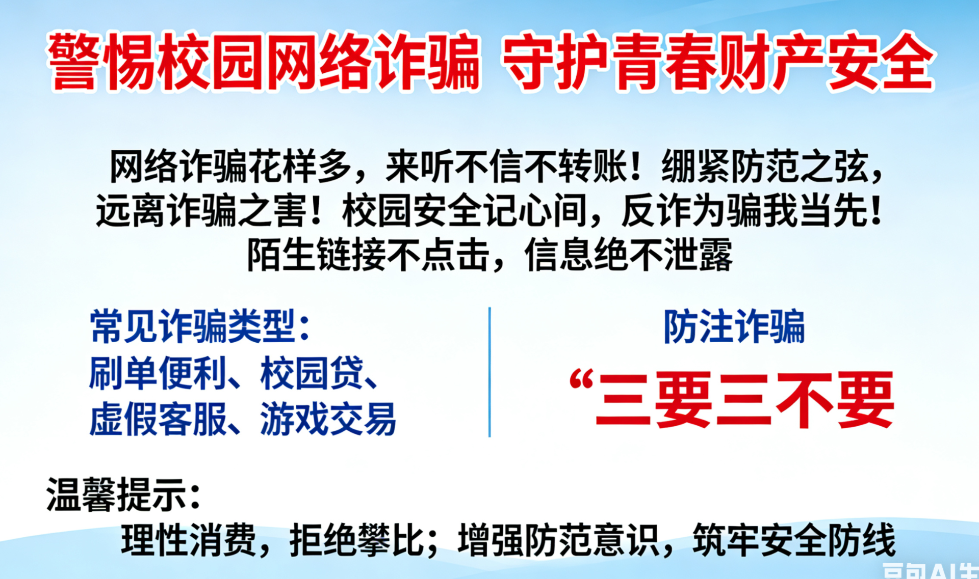 “慧眼识诈·青春护航”校园网贷反诈宣传活动,通过套路拆解、民警讲解、案例警示,教你识破校园贷陷阱,树立正确消费观,守护大学生“钱袋子”。报名后加微信。15550045733