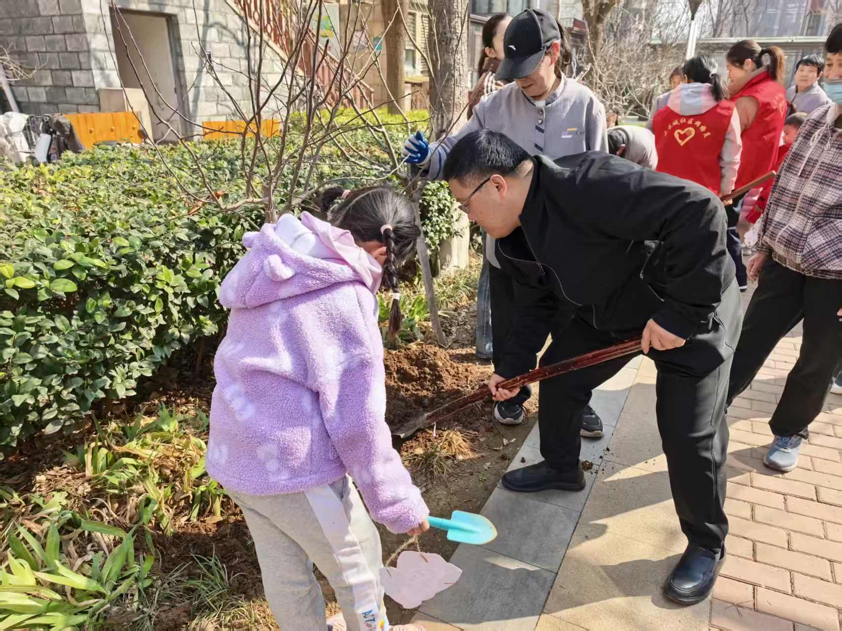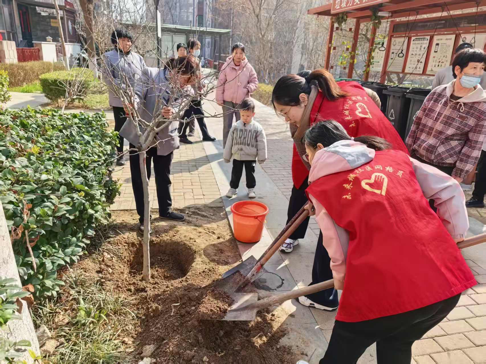 为增强居民绿色环保意识,倡导爱绿护绿理念,组织居民共同植树增绿、美化家园,营造整洁优美、生态宜居的社区环境,共建绿色文明幸福社区。