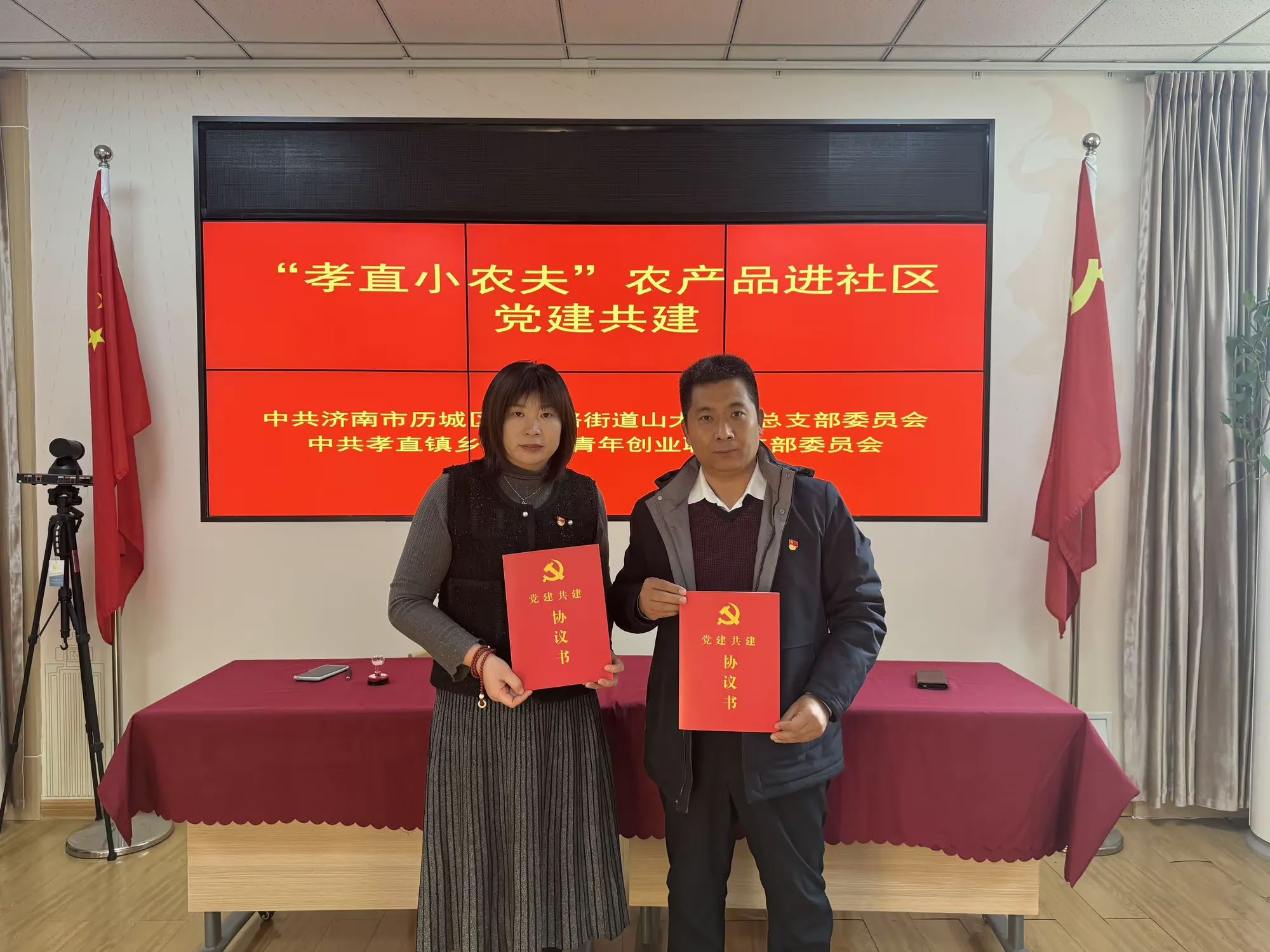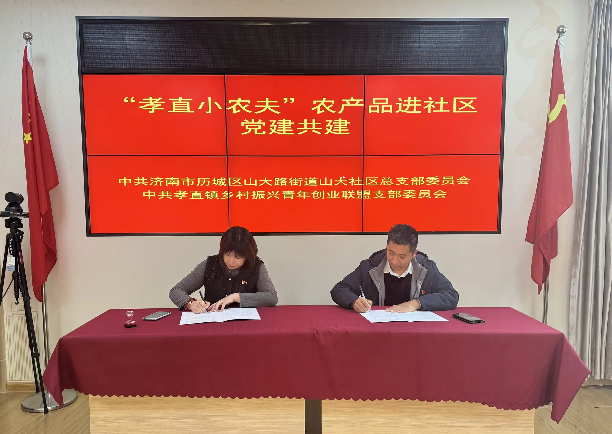 历城融媒讯  为进一步提升党建引领基层治理工作成效,本着“资源共享、优势互补、注重实效”的原则,发挥为农服务主动性,助力乡村振兴,12月3日,山大社区党总支联合平阴县孝直镇西部产业联合党委、济南百家农村合作社青工委、孝直镇乡村振兴青年创业联盟党支部、孝直镇刘家庄村村民委员会开展乡村振兴好物严选“第一书记”农产品进社区活动,并进行支部共建签约仪式。