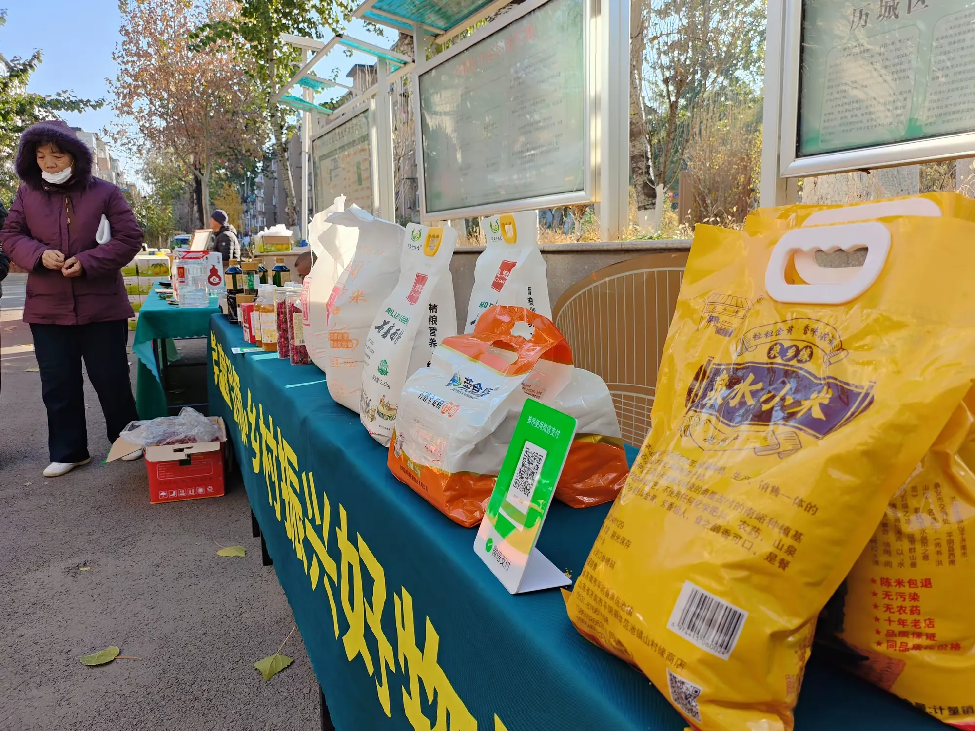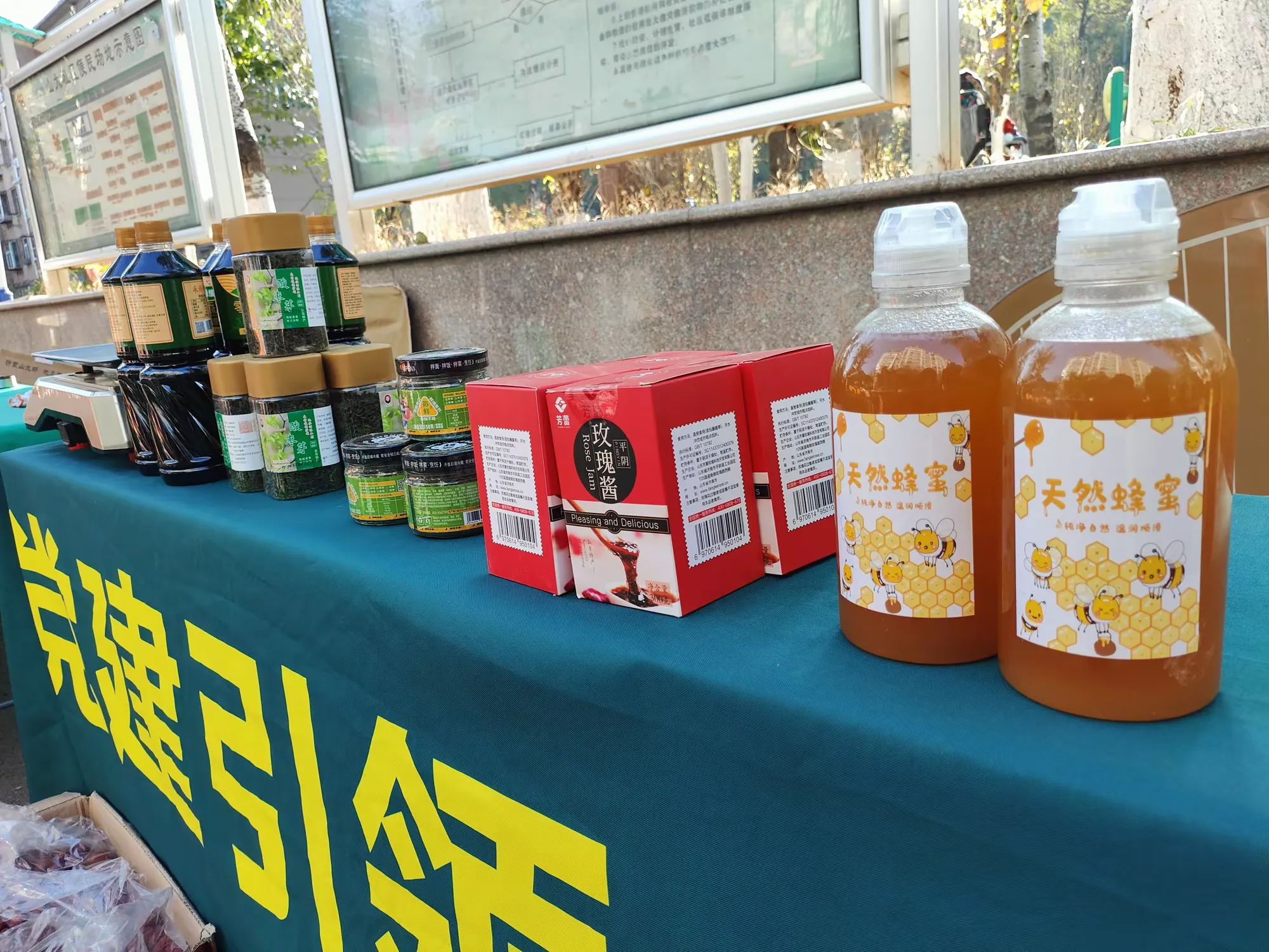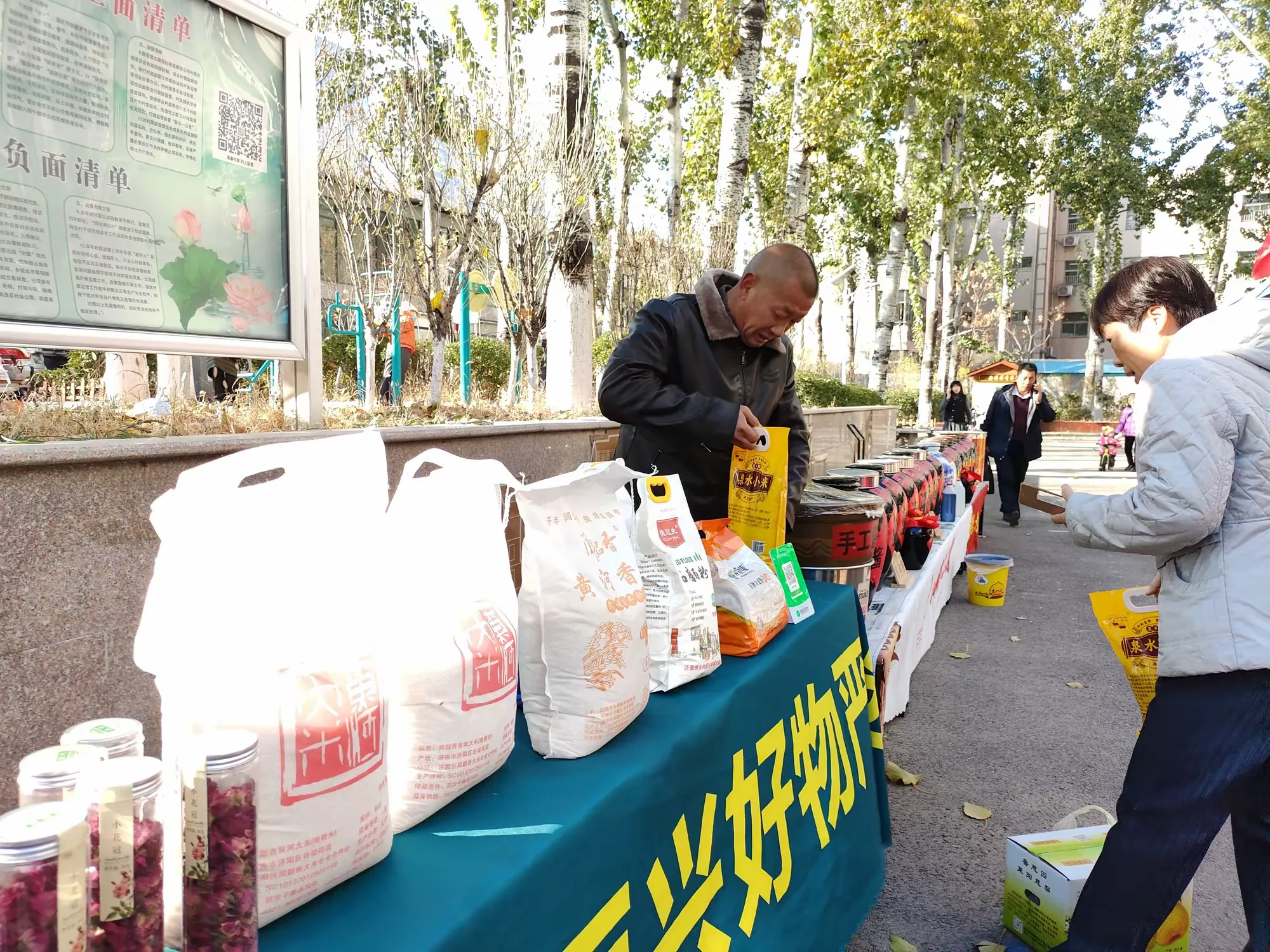 “孝直小农夫”乡村振兴好物严选农产品丰富多样,有传统工艺制作无添加剂的石磨全麦粉、农村自磨面粉木兰巾麦香王、平阴特产玫瑰花饼、平阴玫瑰花玫瑰酱、谷香味美的山地小米、青椒酱、天然山养蜂蜜、纯天然蜂巢蜜、纯绿色泉水粉皮、南邱村粉皮、纯粮食陈醋、酱油、全麦挂面、黑麦苦荞挂面、黄河香米、花生、国产黄豆、红豆、绿豆等健康食品,吸引居民驻足购买。